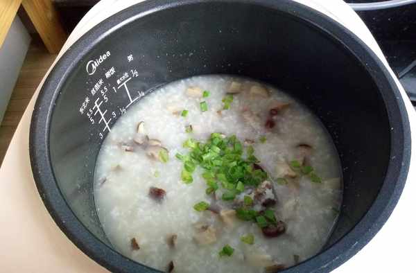 5.泡发好的香菇切丁。当电饭煲跳档煮粥结束以后,加入香菇丁,继续煮10分钟左右。(也可以在煮粥结束前10分钟加入香菇丁,但是我这个电饭煲看不出时间)