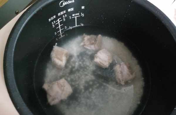 4.把大米和排骨放入电饭煲中,加入适量的水,按煮粥键。