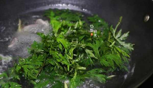 5.接着把洗干净的嫩艾叶尖儿放入锅中,大火煮沸后加少许花生油,避免艾叶颜色发黄。艾叶特别容易熟,入锅后叶子颜色变深,有淡淡的艾叶味就可以关火了。
