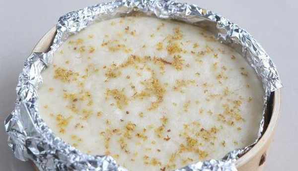其次,将已搅打好的米糊倒入盆里,这时就可加入白糖、酵母再次继续进行搅打均匀,之后再筛入100g低粉,搅打细腻至无颗粒的状态;接着放在温暖的地方发酵至两倍大小,用筷子搅拌排出气体;再用蒸笼屉上铺上一层锡纸,搅匀的面糊倒入蒸笼屉上,撒适量桂花上去,隔水上锅蒸大约35分钟左右;