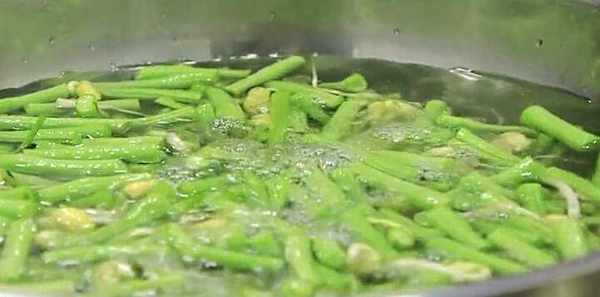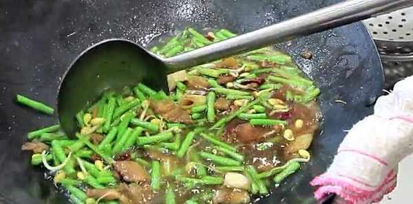 5、再把准备好的青菜放到锅里,给它翻炒一会,等到把青菜炒至五成熟的时候,在里面加上清水。