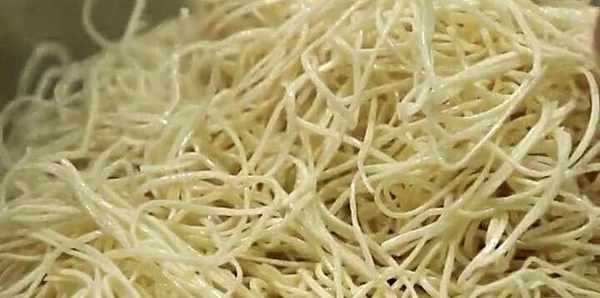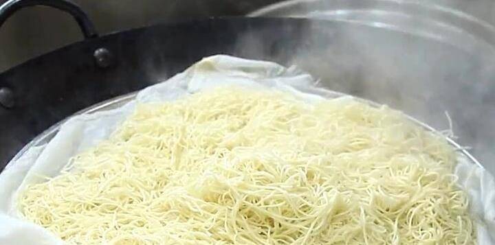 7、锅里面烧水,放上篦子,铺上一块干净的白纱布,把面条放在篦子上面,盖上盖子,中火蒸上七分钟,之后取出倒在小盆里。