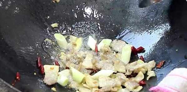 4、在锅里烧油,把五花肉放在锅里,再抓上两粒八角,大葱,生姜和干辣椒,快速翻炒,给它炒出香味。