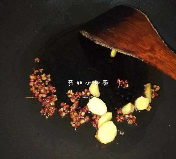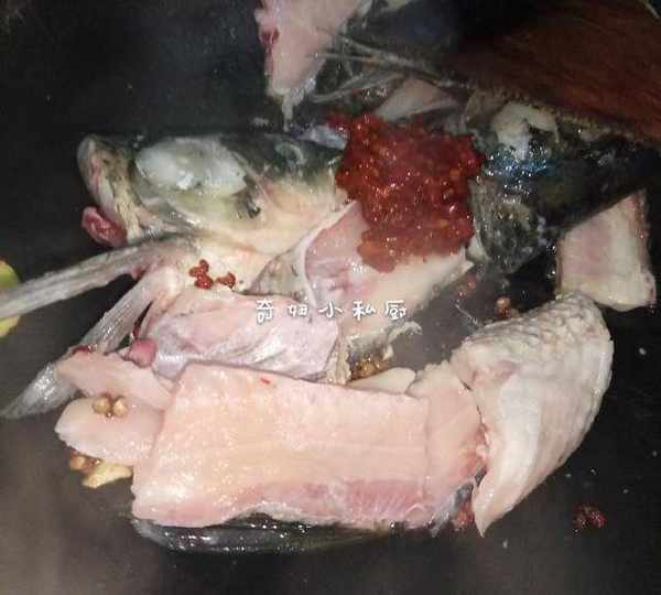 5.另起锅,锅中加少许油,油热,爆香姜片,蒜,花椒(也可以放进少许干辣椒)然后加进鱼头,鱼骨,稍微煎一下,加进2勺豆瓣酱,炒匀,加适量水。
