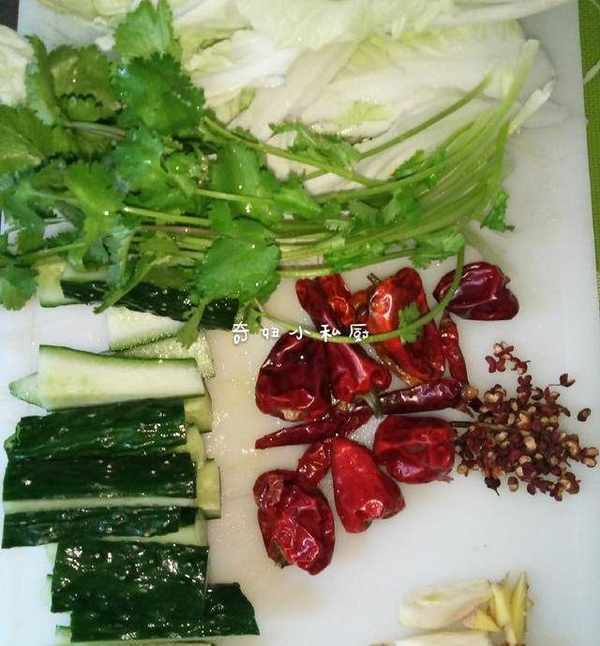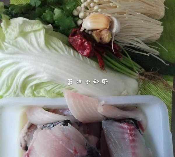 草鱼一条(两斤出头),黄瓜一根,大白菜3片,豆芽少许,红辣椒适量,花椒一小把,姜一小块,蒜头2瓣,香菜一棵,金针菇少许。