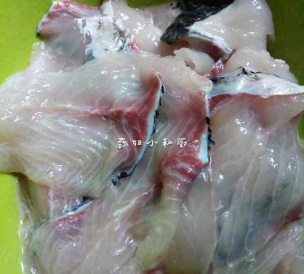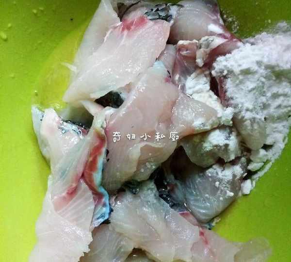 2.鱼的部分我都让店老板帮忙处理了,这里就直接回来洗干净,就可以,鱼片要多冲几次水,然后滤干水分,加进一汤勺料酒,一汤勺生粉,少许盐,蛋清一个,抓匀,腌制20分钟。