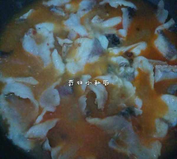 7.继续开火,把鱼汤煮开,快速放进鱼片,不要去翻动鱼片,鱼片基本快变色,关火,盖锅盖,闷2分钟。