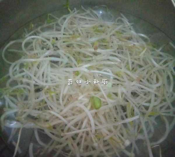 4.起锅,锅里装适量水,水开放进豆芽,焯熟,其他蔬菜如法炮制,煮好了,捞放在盆底部。
