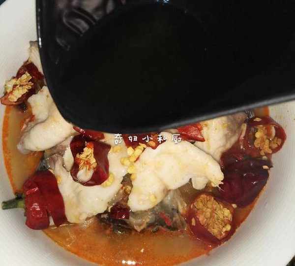 9.将干红辣椒剪段,撒在鱼片上面。起锅,锅热,加适量油,可以多加点,油大热,就烧到稍微冒烟,将油淋在辣椒上面。