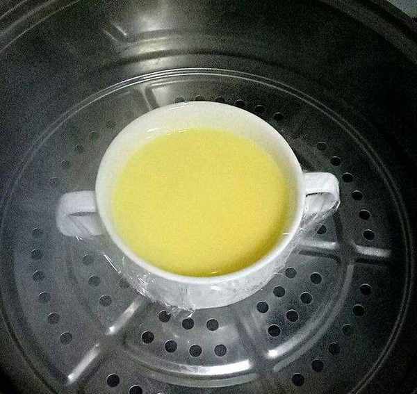 接下来就可以上锅蒸了,上锅蒸的时候还可以蒙上一层保鲜膜用牙签扎上几个小孔,这样也是可以避免蜂窝的,出现蒸鸡蛋羹的时候大概8~10分钟就可以了,如果说鸡蛋比较多的话,那么就延长到12分钟,这样的话我们蒸出来的鸡蛋羹就特别的美味了。