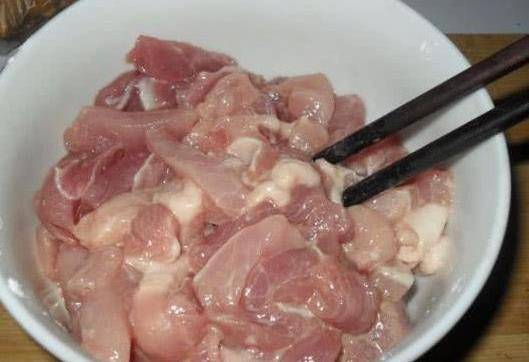 第一步。将里脊肉切成薄片。肉片的大小要大一点。然后放入盐,料酒,老抽,适量的淀粉搅拌均匀,腌制十几分钟。