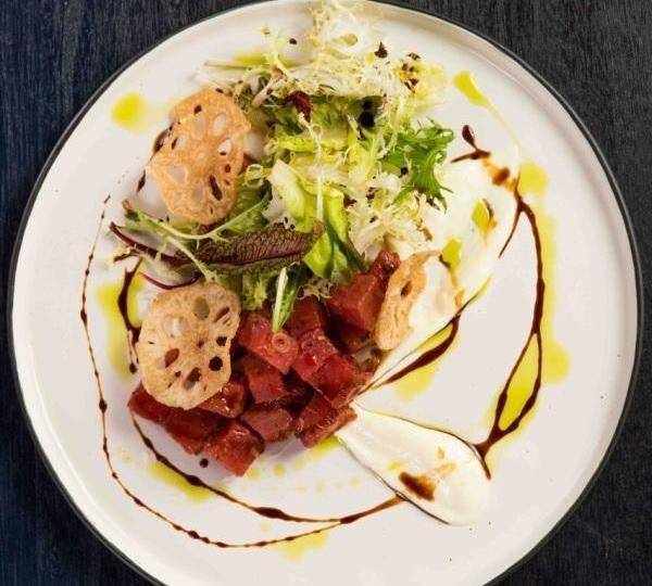 7、酱汁铺底,放上有机混合蔬菜沙拉、腌制好的金枪鱼腩、莲藕脆片。淋上百香果风味黑醋汁、意式罗勒油即完