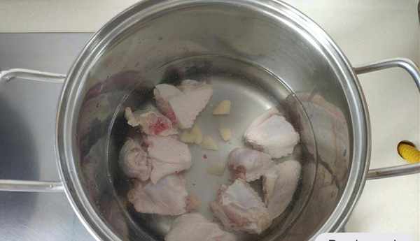 3、锅中加适量清水,加点料酒和几片姜片,放入鸡翅焯水,水开后煮半分钟,控水捞出。