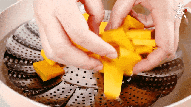 2.南瓜上锅蒸熟,取出,加入白糖,压成泥。