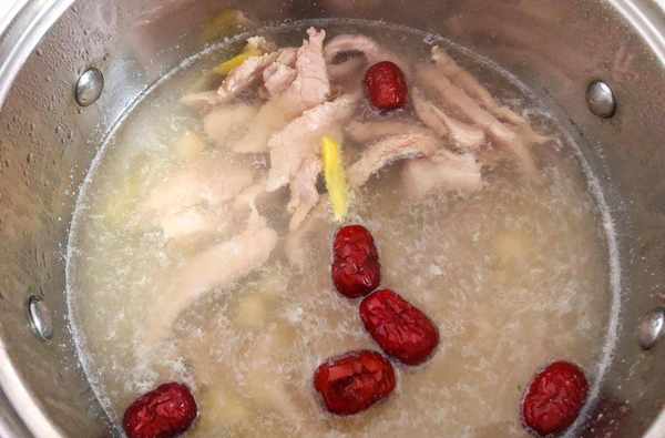 第四步:加入腌制好的瘦肉,在加入姜片,再次煮沸,打开锅盖去血末,盖上锅盖,调中小火炖10分钟。