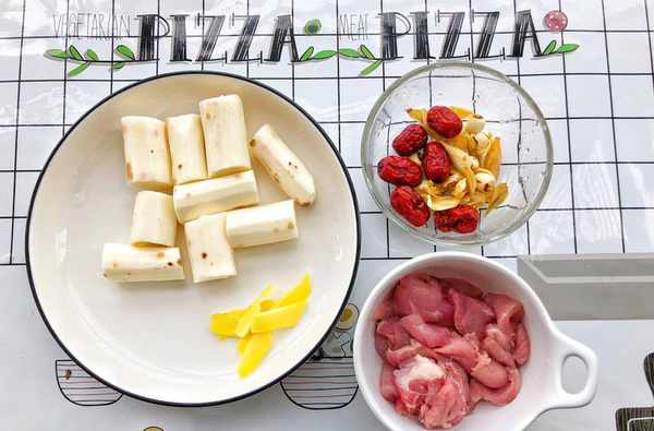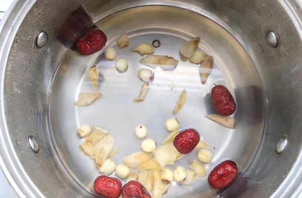 第一步:山药去皮后冲洗干净,再用刀子切小段备用。生姜去皮后冲洗干净,再用刀子切片备用。红枣、百合和莲子用清水浸泡15分钟后捞出备用。