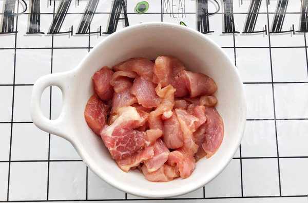 第二步:瘦肉清洗干净后用斜刀切薄片放入碗中,加入适量的花生油、盐和生抽,再加入2勺料酒拌匀腌制半小时左右。