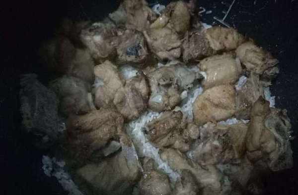 8、先把洗好的大米倒入电饭锅中,然后将焖好的排骨用筷子夹到大米的表面摆整齐。(大米的分量可以根据人的数量来做决定,可多可少。)