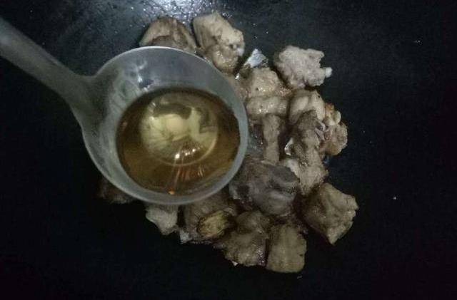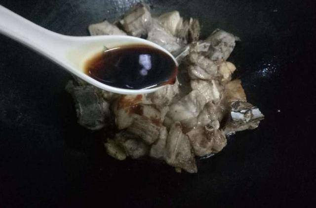 4、排骨翻炒至微黄之后,再倒入一小勺的生抽,老抽,翻炒至上色。