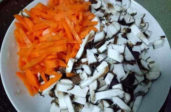 2、把香菇清洗干净,然后切成香菇丁,胡萝卜去皮,洗干净之后先切成块再切成胡萝卜丁备用。