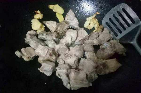 3、起锅烧油,油热之后先放入生姜片,蒜片煽出香味,再把洗好排骨倒入锅中翻炒,炒至排骨的两面微微发黄。