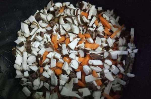 9、将之前切好的胡萝卜丁、香菇丁倒入电饭锅中,然后把剩下的汤汁倒入大米中。(在加入汤汁的时候要掌握好水位,不要放太多也不要太少,刚合适即可,如果水放的过多,会影响米饭煮出来的口感)