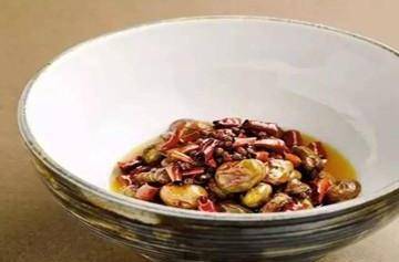 6、炒锅中放入适量五香料油烧至四成热,再放入少量大红袍花椒、干麻椒、干辣椒段,炸香后将油倒入盛放蚕豆的大碗中,加白芝麻、京葱段即可。