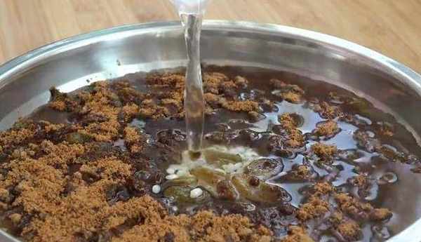 稍微压实一点,不要有空隙,再撒上一层红豆,红豆是提前煮熟的,然后再重复盖上一层糯米,同样的给他按压紧实,上面撒上一层葡萄干,最后在表面撒上适量的红糖,不喜欢吃甜的也可以不放,最后倒入清水也不用太多,刚好没过红糖就行了。凉水放入锅中开大火烧开。