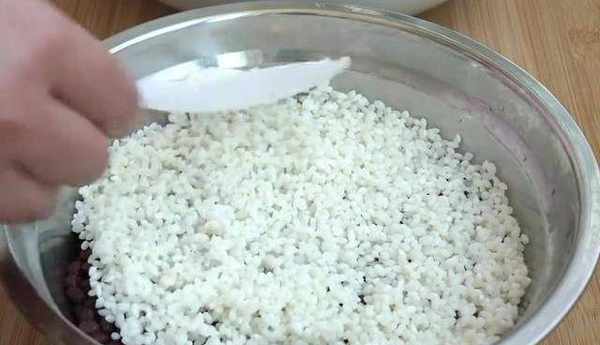 现在盆里倒入400克的糯米,倒入清水浸泡一个晚上。糯米用手一捏就碎即可,这样更容易蒸熟,准备一把大红枣,用清水清洗干净,然后用剪刀把枣肉剪下来。取一个不锈钢盆,盆的周围刷上一层食用油,把红枣均匀地摆在底部。铺好以后在上面撒上一层糯米。