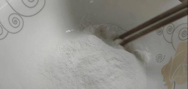 1.糯米粉放入大碗中,少量多次加入沸水。