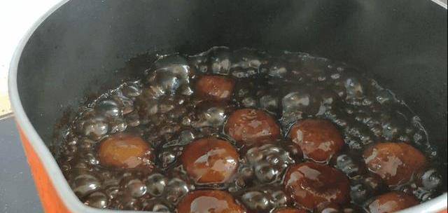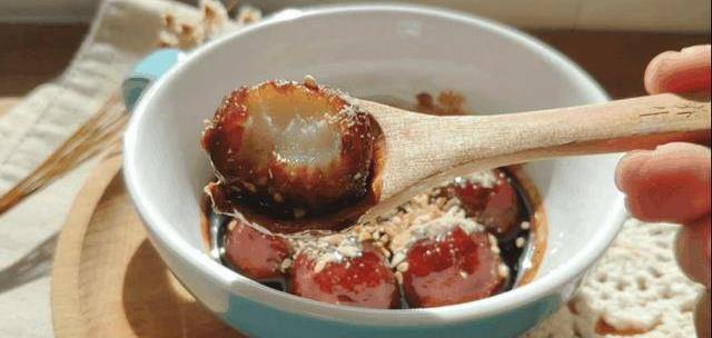 7.锅中加水,放入红糖,小火加热放入糯米团子,煮至浓稠、团子裹满糖浆即可。