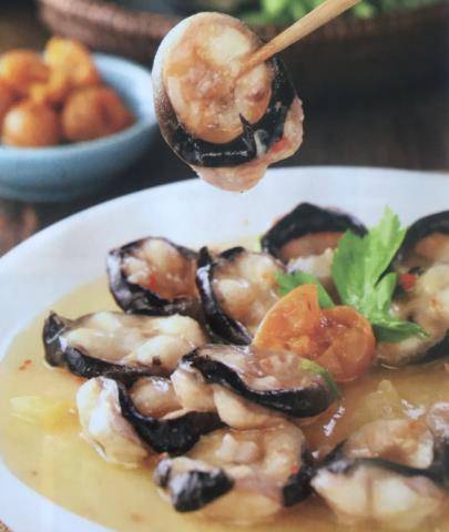 鳗鱼在当地被称作水中人参,有降血脂、抗血栓等功效。将鳗鱼与潮汕咸菜、酸梅搭配,大火蒸制2分钟,取原汤淋在鳗鱼上,汤汁中的酸爽夹带着鲜甜,使鳗鱼肉软嫩中微带韧性,是当地食客十分喜爱的一种吃法。初加工将鳗鱼1条宰杀制净(每份取250克),切成0.6厘米厚的薄片,洗净沥干。腌制取鳗鱼肉放入容器,抓入自制酸梅酱25克拌均匀至入味。