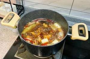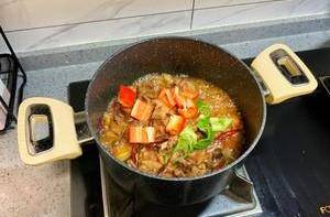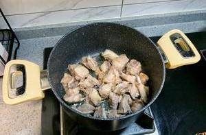 7、加2-3勺生抽、半勺老抽、1勺蚝油、1勺黑胡椒粉、1-2粒冰糖调味,大火煮开,转中小火慢炖,此处调味可根据自己口味适量增减。