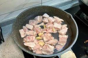 2、鸭肉冷水下锅,加料酒,姜片,花椒焯水,煮开后捞出,清水洗净。