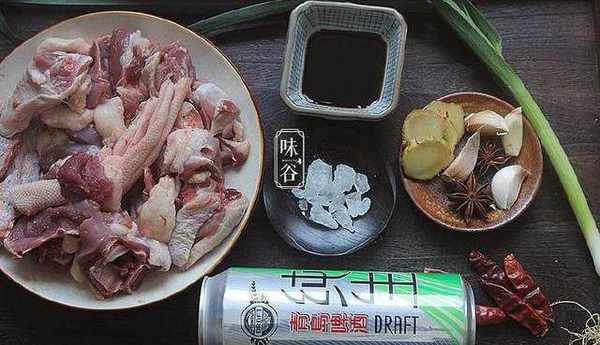 【材料】:啤酒1罐、鸭半只、酱油3勺、冰糖20克、姜蒜适量、八角2个、葱1棵、料酒1勺、干辣椒适量、