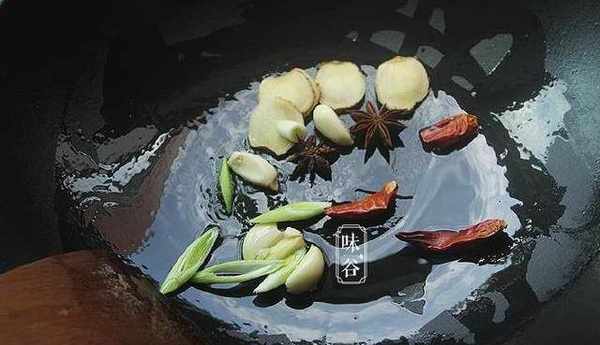 3、锅中烧热油,放葱姜干辣椒爆香,锅内放油烧热,放入蒜瓣、姜葱、八角、干辣椒爆香;