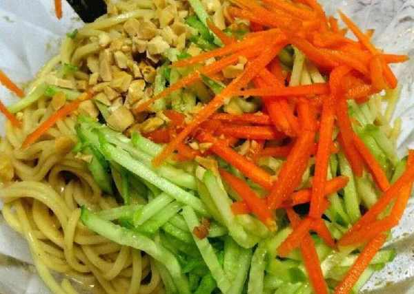 4.把熟面条、黄瓜丝、胡萝卜丝一块放入碗中,再把调好的酱料倒入,搅拌均匀,可以撒点香菜或者白芝麻、花生碎都可以,不喜欢可以不放。
