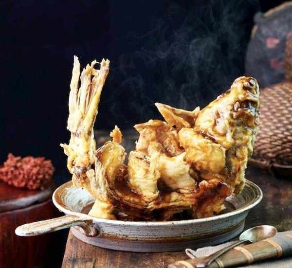 鲤鱼在刀口处撒上湿淀粉,再放在7成热的油中炸至外皮变硬,用微火浸炸6分钟,再改旺火炸至金黄捞出摆盘