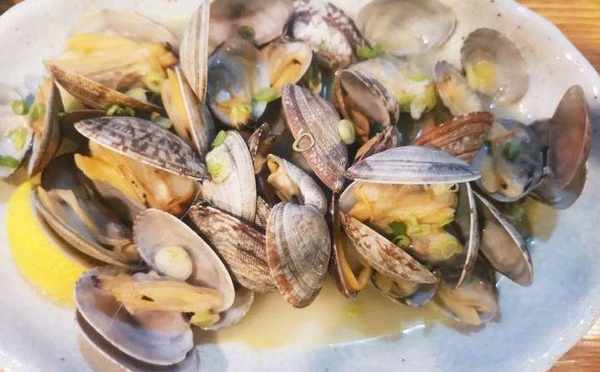 将花蛤放入平底锅中,加入清酒稍微没过花蛤,放入一小块黄油,开火煮