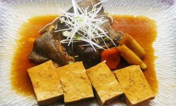 鲽鱼头一开为二、香菇1个、胡萝卜1小块、老豆腐、大葱段、姜片、葱丝、葱花、清酒、味淋、农口、绵白糖