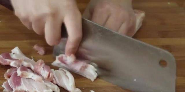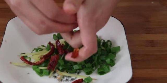 2.拿出来一把小葱出来,把小葱清洗干净之后切成大小相等的葱花。再拿出来一块生姜,把生姜先切成片,再切成丝,切好之后把葱花和姜丝一起放入盘子里面待用即可。接下来拿出来一块五花肉,把五花肉切成薄厚均匀的肉片。