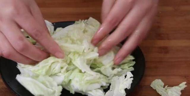 1.拿出来一颗大白菜,用刀切掉白菜的根部,把白菜放入清水里面清洗干净。然后把白菜控干水分捞出来放入案板上面用手撕成大小相等的小块,把白菜全部撕成小块之后将其放入事先准备好的盘子里面待用就可以了。
