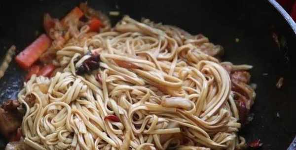 6.炒匀之后倒入适量的清水进去,盖上盖子上去中火焖煮3分钟的时间。锅中汤汁煮开之后用舀出来一勺料汁放在碗里面待用即可,接着把事先准备好的干挂面整齐的铺在锅里面,把刚才舀出来的汤汁倒入锅里面,开中火焖煮2分钟的时间。
