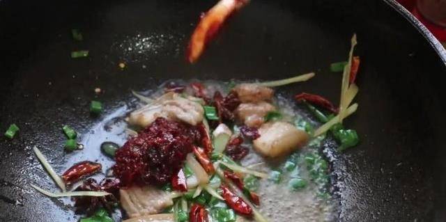4.起锅烧油,锅中倒入适量的食用油进去,油热之后倒入刚才切好的五花肉片进去翻炒,用铲子不停的翻炒,炒出油脂出来,接着在锅中下入葱花,姜丝,干辣椒,八角进去翻炒,炒出香味出来。接着加入适量的料酒,豆瓣酱进去炒出香味。