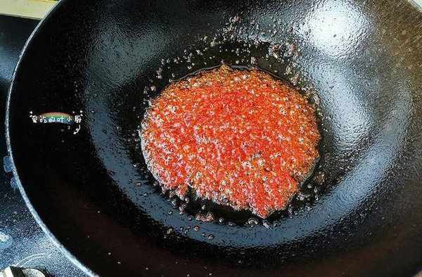 3.把锅烧热后往锅中倒入适量的食用油,油热后改成小火,然后把番茄酱放入锅中翻炒,要把番茄酱炒化炒出红油。