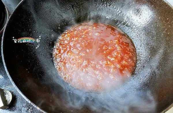 5.炒成番茄汁后就放入三勺白糖、两勺白醋和少量的盐调味,这时候要注意改成小火慢慢翻炒,不要把糖炒老了,炒老了会有些苦味的。
