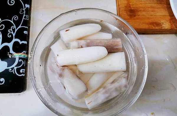 2.铁棍山药蒸好后表面会有些黏液,我们需要把山药切成小段然后放入水里清洗一下,把表面的黏液洗掉。