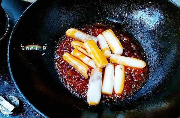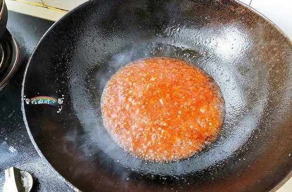 4.番茄酱炒好后改成中火,然后放入一勺料酒调味,接着再倒入少量的清水,把番茄酱彻底炒成番茄汁。