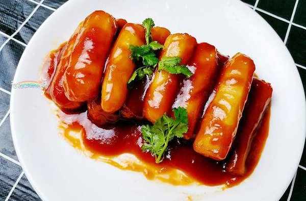 7.炒山药时要大火翻炒,山药表面特别滑,酱汁不容易包裹上去,所以大家要多炒一会,把山药炒成红色后就盛入盘中,然后把锅中的糖醋酱汁淋在山药上即可。