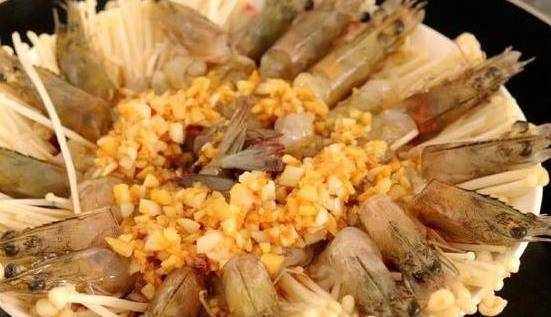 准备材料:大虾16只,金针菇1把,蒜粒1粒,葱花2根,生抽1匙
